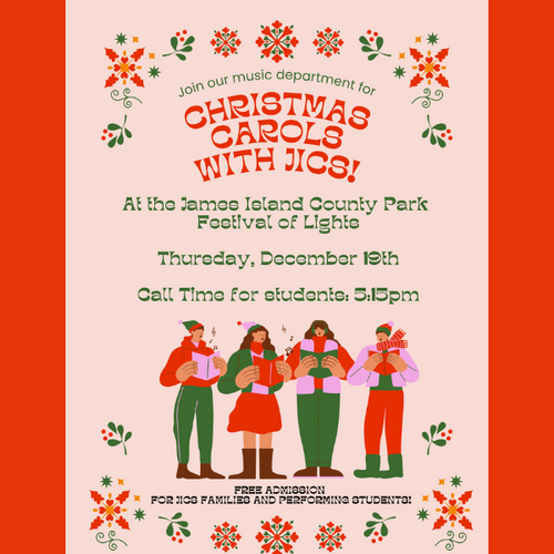 JICS is Christmas caroling at the James Island County Park Festival of Lights on Thursday, December 19th. Call time for students is 5:15 PM and admission is free for JICS families and performing students!